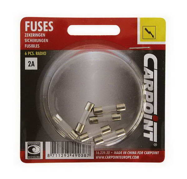 Jeu de fusibles de rechange Carpoint de 2 Ampères en verre pour radio pour remplacer un fusible défectueux. Ces fusibles en verre sont principalement utilisés dans les autoradios. Remplacez toujours le fusible cassé par un fusible de même ampérage. Les fusibles en verre de Carpoint sont fournis par 6 pièces dans un blister.