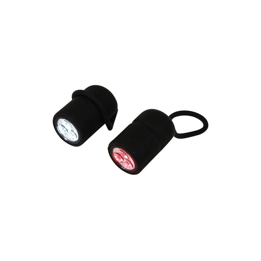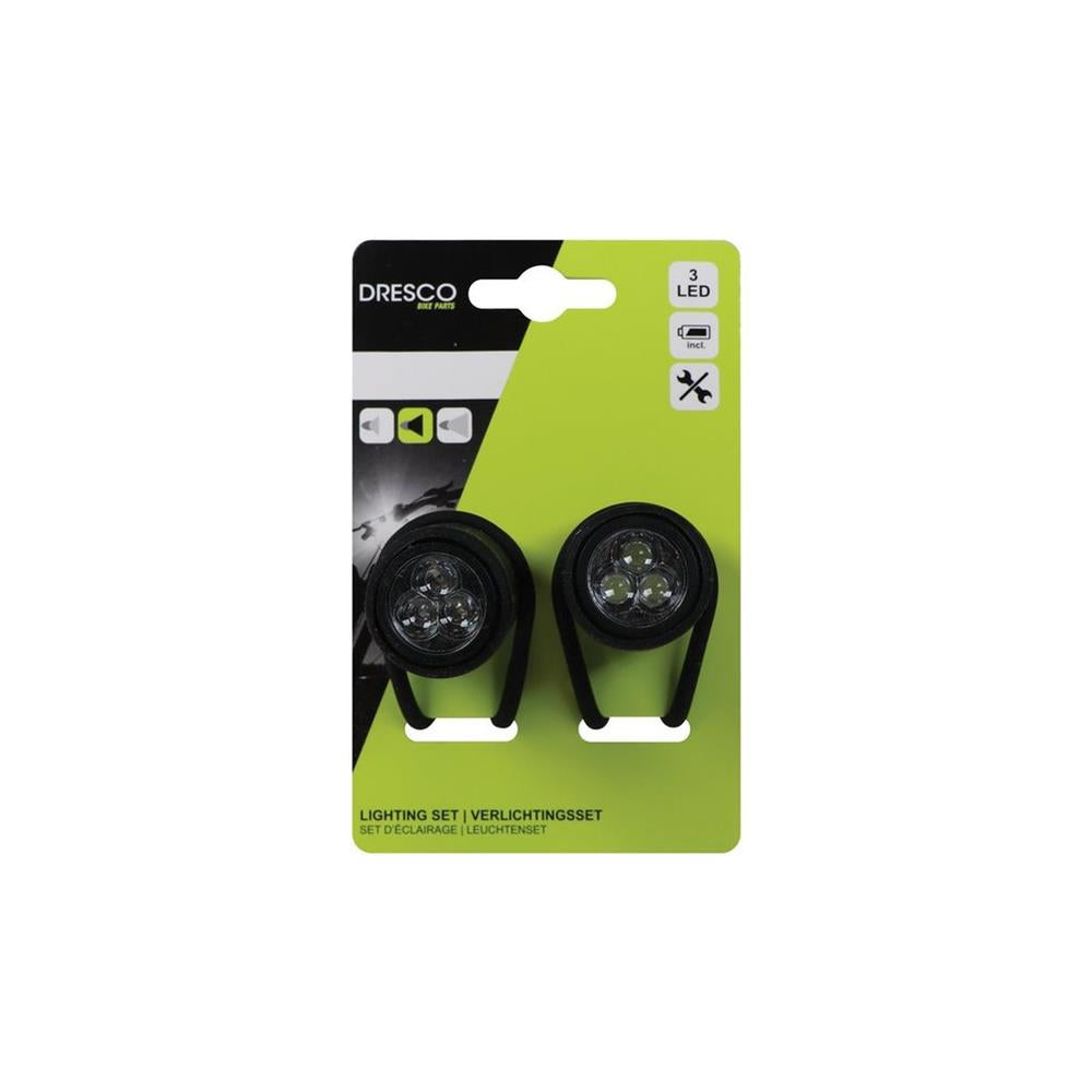 Jeu de feux Dresco, avant et arrière, complet et compact, avec fixation en silicone souple. Feu avant avec 3 LEDs blanches et feu arrière avec 3 LEDs rouges. Avec fonctions marche /arrêt et clignotant. Se fixe sur le tube de la selle et le guidon, diamètre de 22,2 à 31,8 mm. Fonctionne avec 1 pile CR2032 fournie.